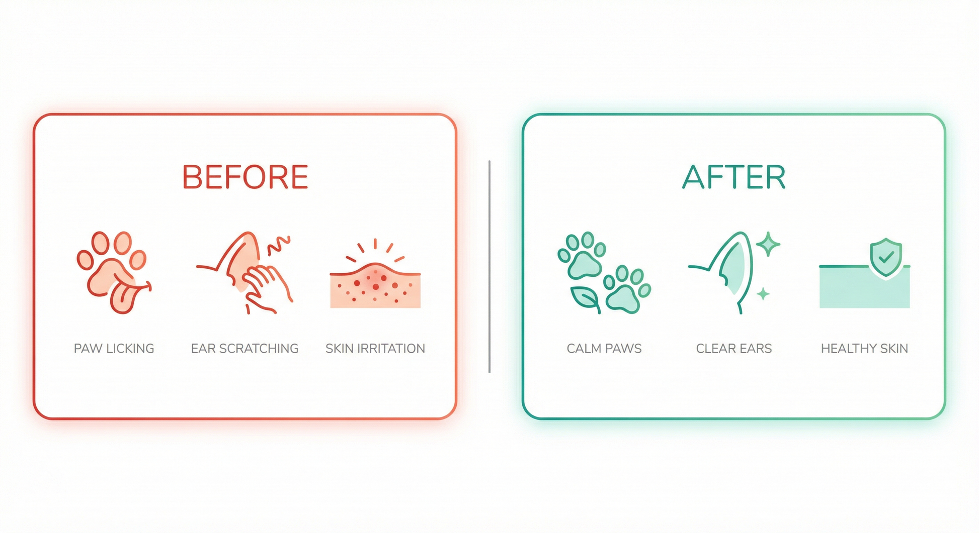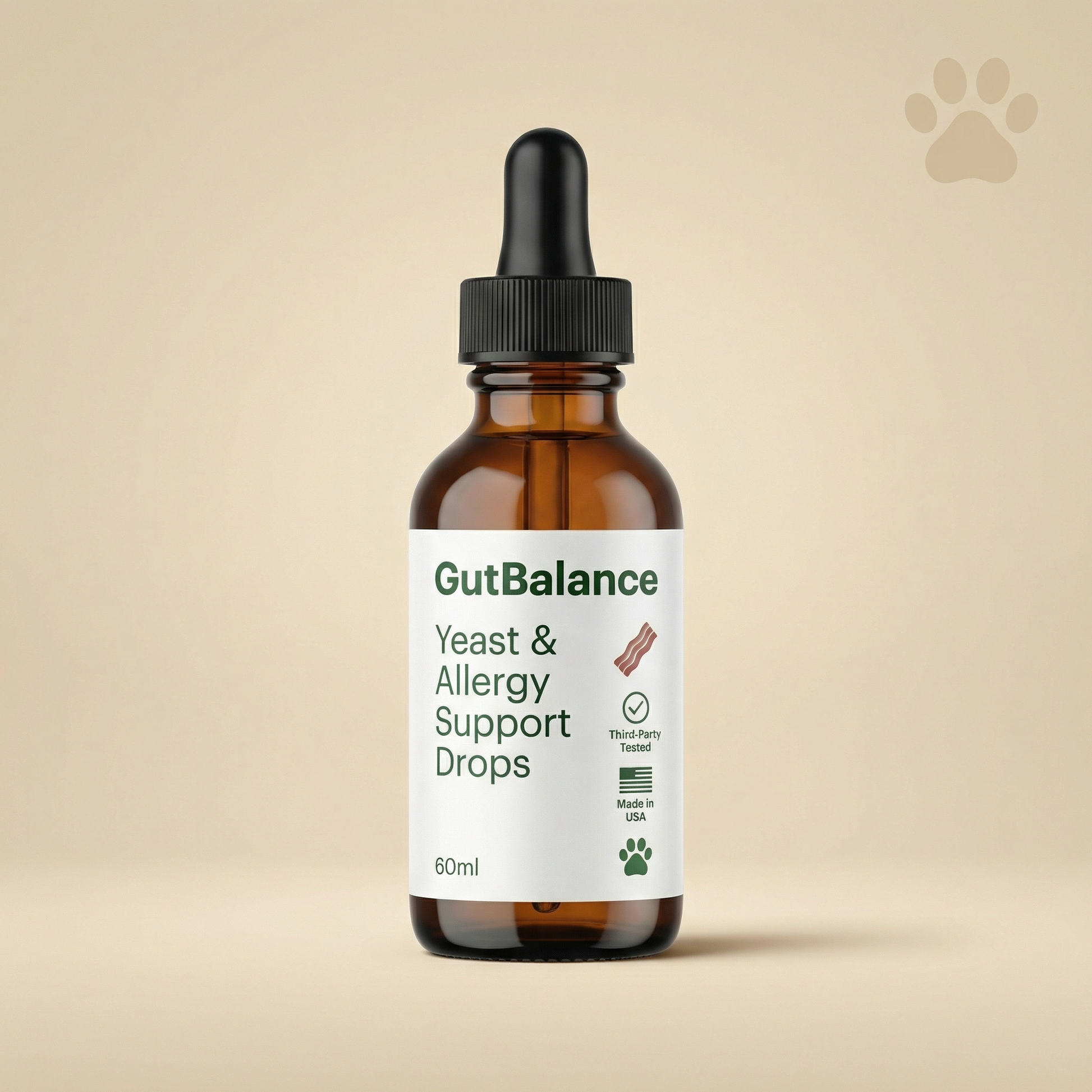 86% of dogs diagnosed with 'chronic allergies' actually have a gut microbiome imbalance. You can treat the skin, ears, and paws all day long — but if yeast keeps being fed from the inside, it keeps coming back. GutBalance addresses the root cause with just 2 bacon-flavored drops a day.